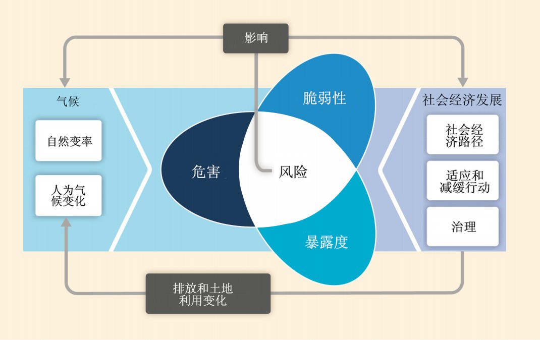 报告对气候变化风险、影响、灾害、暴露度、脆弱性和适应等基本概念作了清晰的界定。气候变化的影响是气候变化风险对人类和生态系统产生的最终后果。气候变化的风险指气候变化引起的潜在后果,可以用气候变化影响或者后果发生的概率和后果的乘积来描述,是经气候变化危害、暴露度和脆弱性三方面相互作用后产生的。危害是指气候变化相关的事件或趋势造成人员伤害和其他健康影响以及对财产、基础设施、生计、服务设施和环境资源造成的损害和损失。暴露度是指人类、物种、生计、生态系统、环境服务和各种资源、基础设施或经济、社会或文化资产出现在受严重影响地区的程度。脆弱性指的是受到不利影响的倾向和趋势,包含如敏感度、易感性和缺乏应对和适应能力等多个元素。