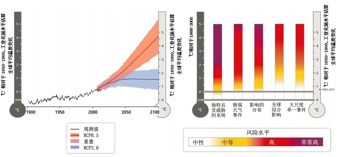 基于这五大理由,报告对RCP2.6和RCP8.5情景下未来气候变化的风险进行了评估。这两个IPCC第五次评估报告确定的典型浓度路径情景,其中一个代表2℃情景,而另一个对应着较高温升的4℃情景。报告结果表明,目前对独特且受威胁的系统已受到中等程度的气候变化风险的威胁, 2℃温升情景下五大关注理由所遭受的风险处于中等至高风险之间,而温升4℃的情景下则处于高或非常高的风险水平。