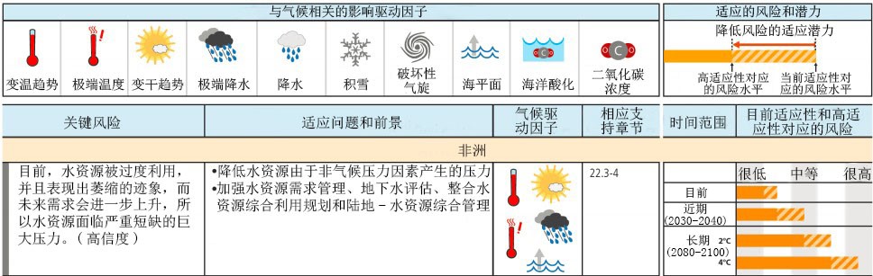 在关于各区域风险和适应机会的评估中,对于每个区域的关键风险,报告给出了两项主要指标,即现有适应措施下的风险和充分适应措施下的风险,两者之间的差距代表适应赤字。很明显,在对目前适应的分析中,每个区域都存在或多或少的适应赤字,反映出不同区域的各个国家都存在加强适应的诉求。